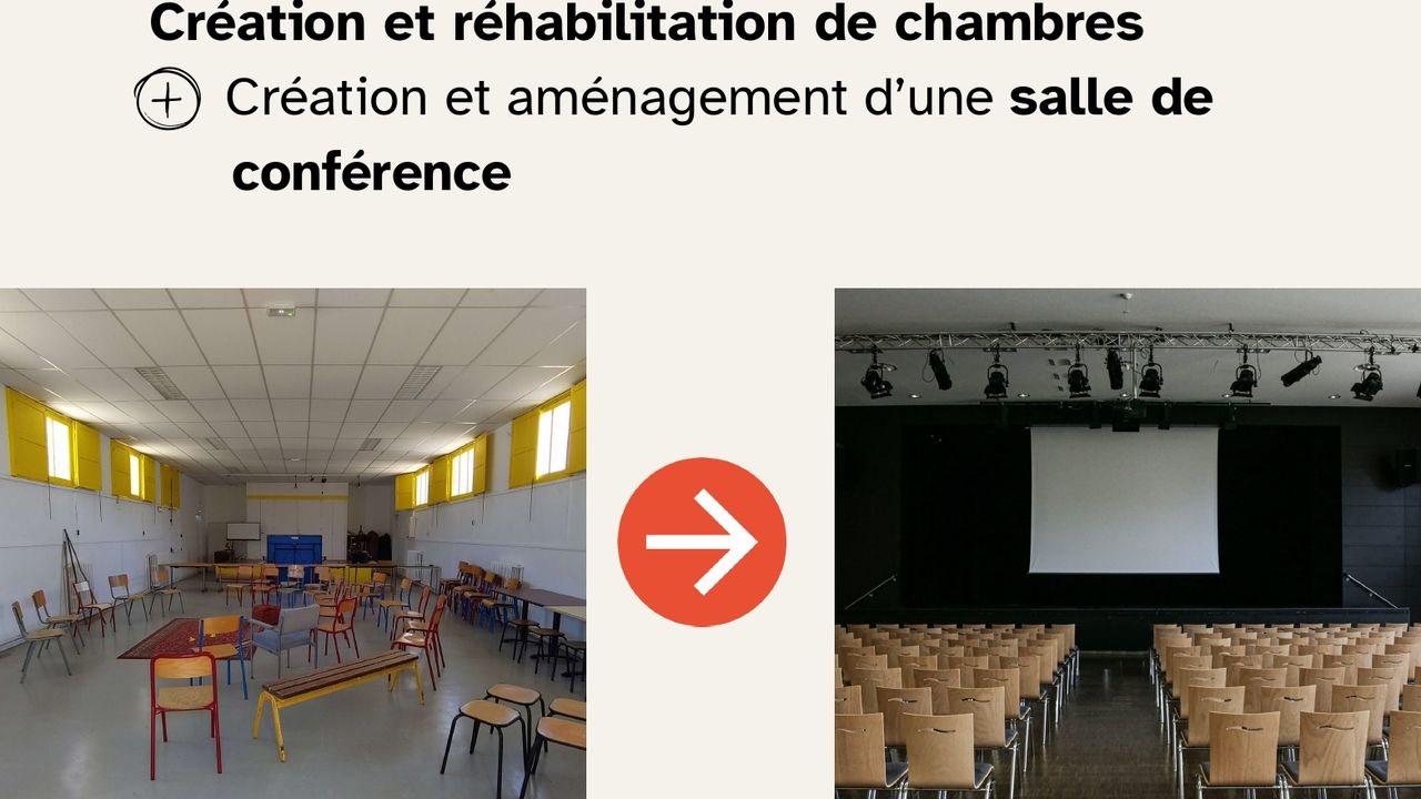 - Restaurer et équiper notre salle polyvalente : une centaines de chaises, équipements audio, rétroprojecteur, isolation thermique, chauffage ...