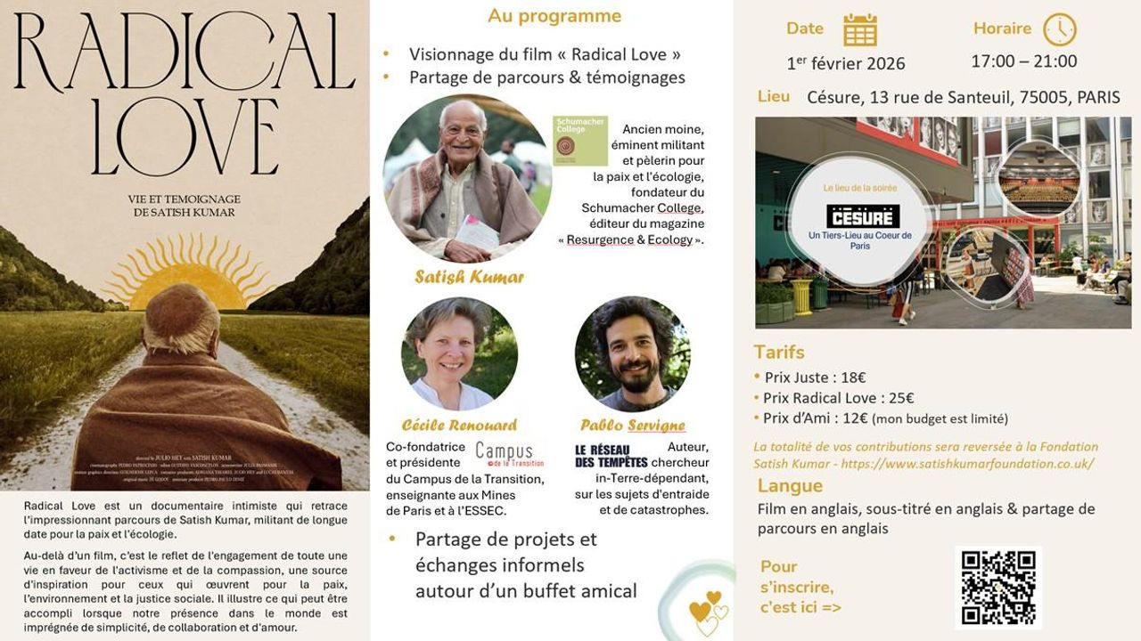 Ce temps exceptionnel nous réunira autour de Satish Kumar, pèlerin de longue date pour la paix et l'écologie. Cécile Renouard et Pablo Servigné interviendront à ses côtés.
